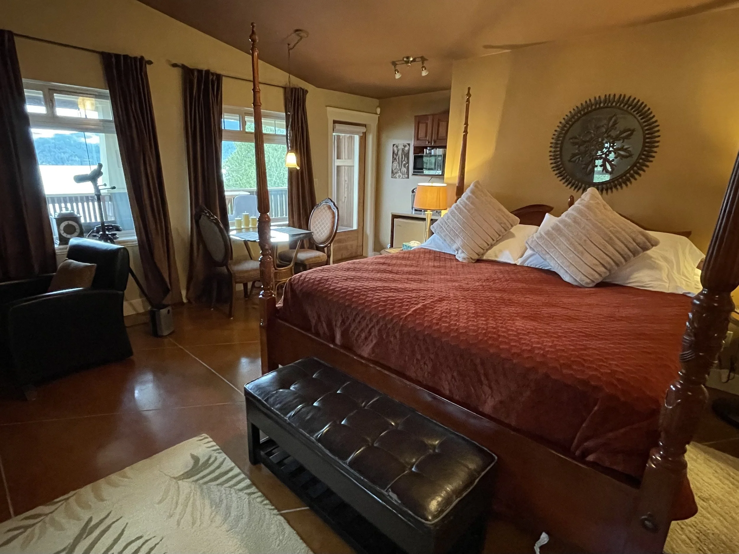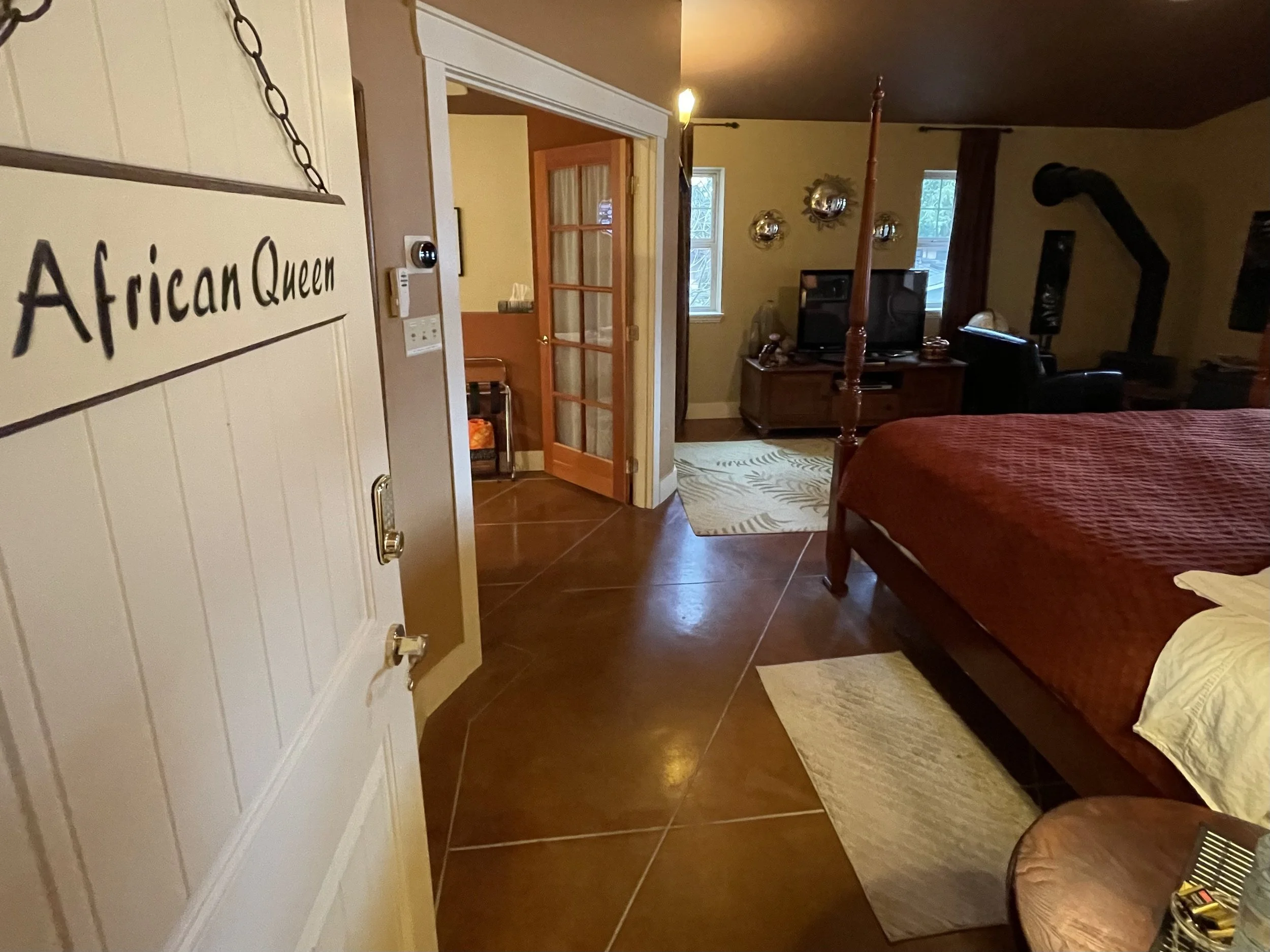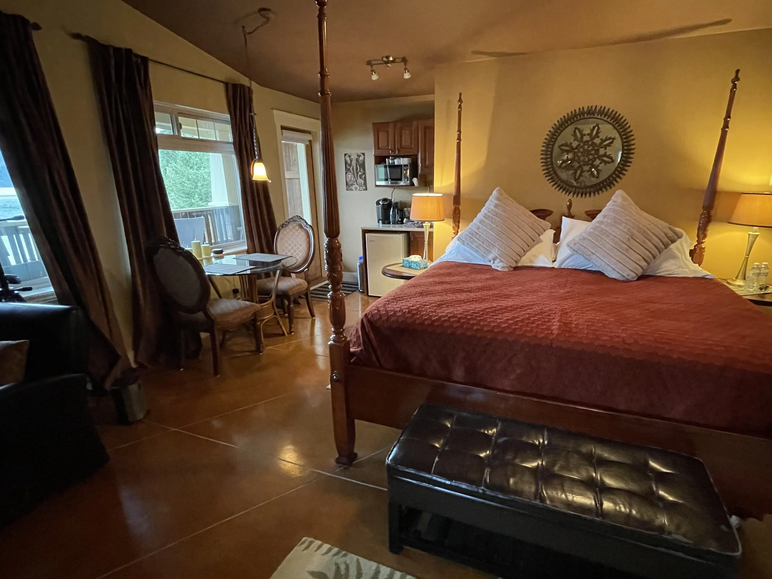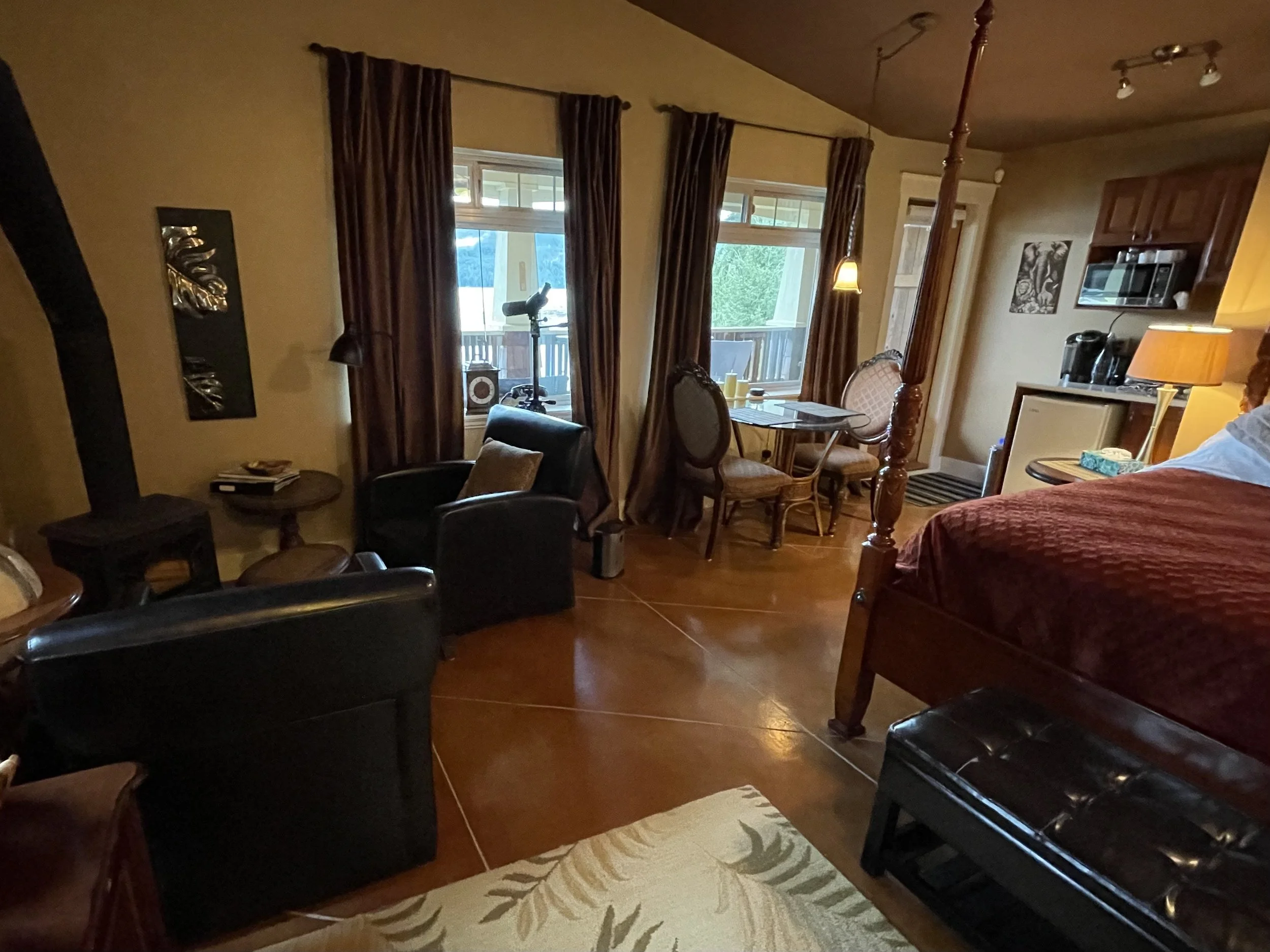 AFRICAN QUEEN FEATURES A KING SIZE CLOUD BED, PRIVATE DECK WITH OCEAN VIEWS, WOOD BURNING FIREPLACE, SLIPPER TUB, TWO PERSON SHOWER, MOOD LIGHTING, NETFLIX, AMAZON MUSIC, IN FLOOR HEATING, KITCHENETTE WITH BAR FRIDGE AND MICROWAVE.