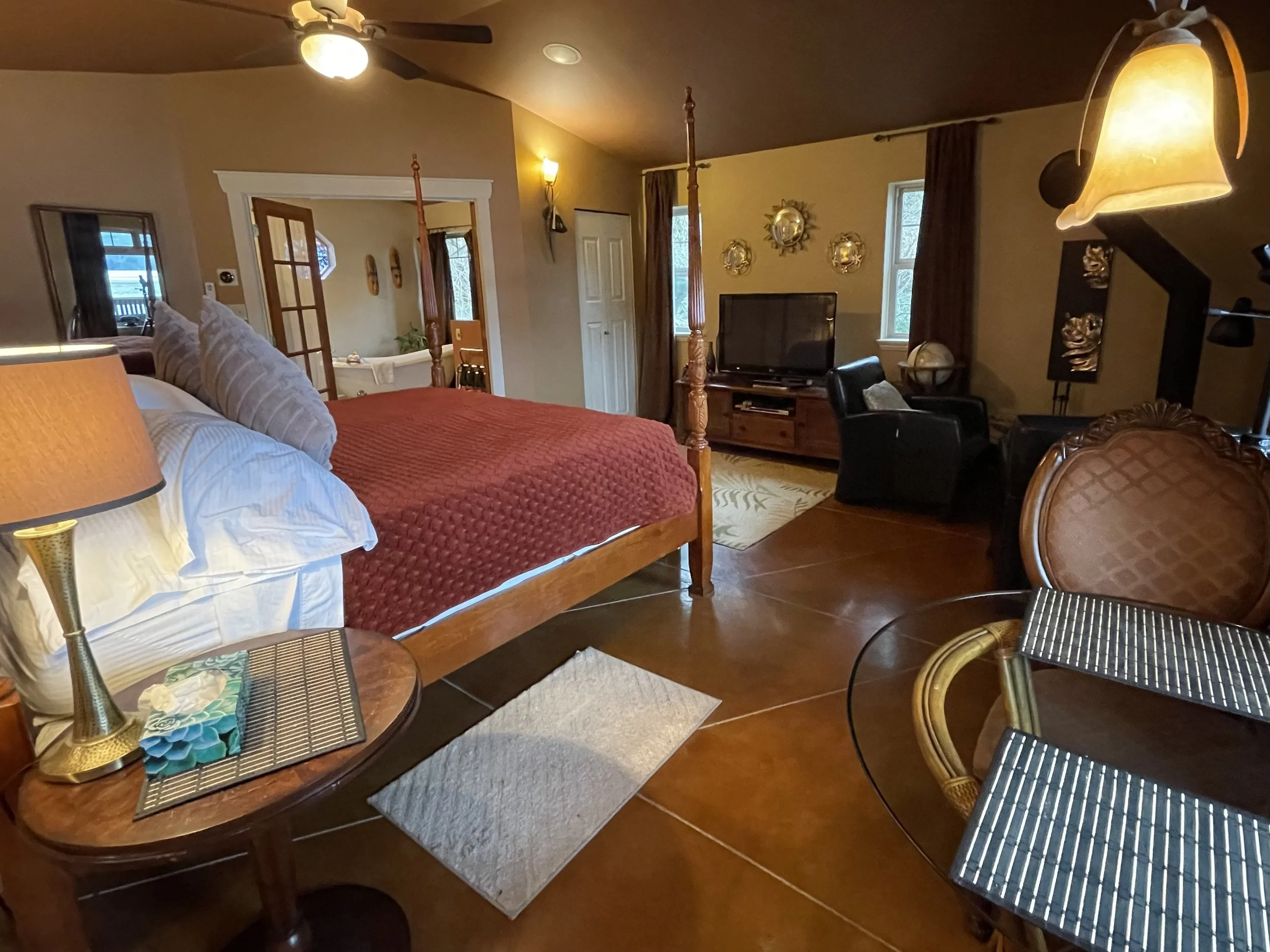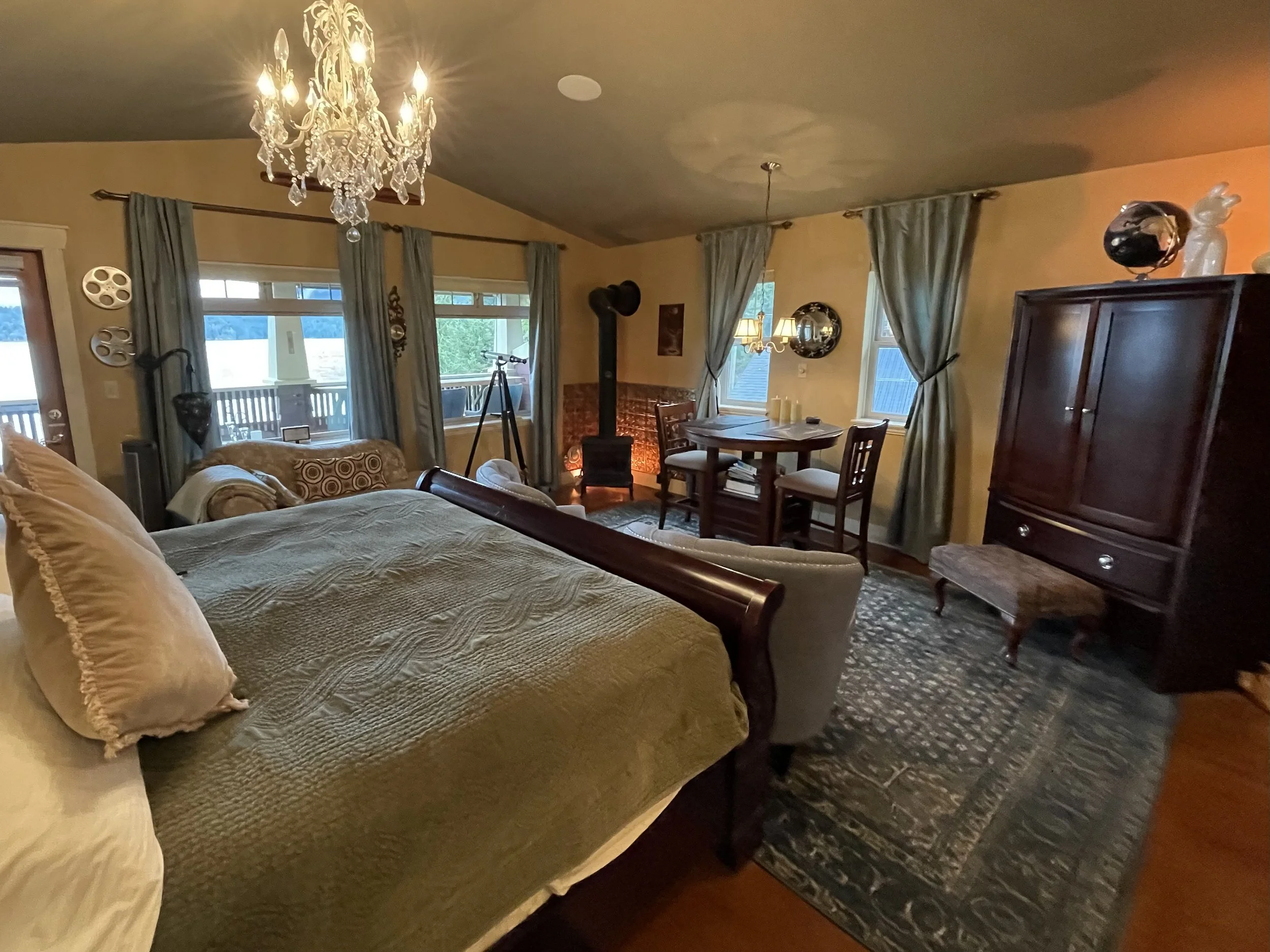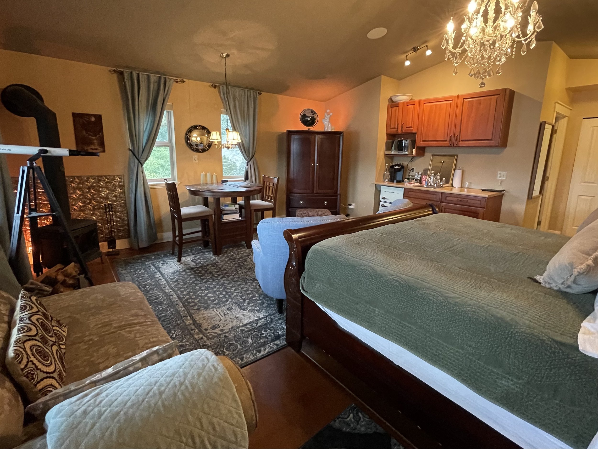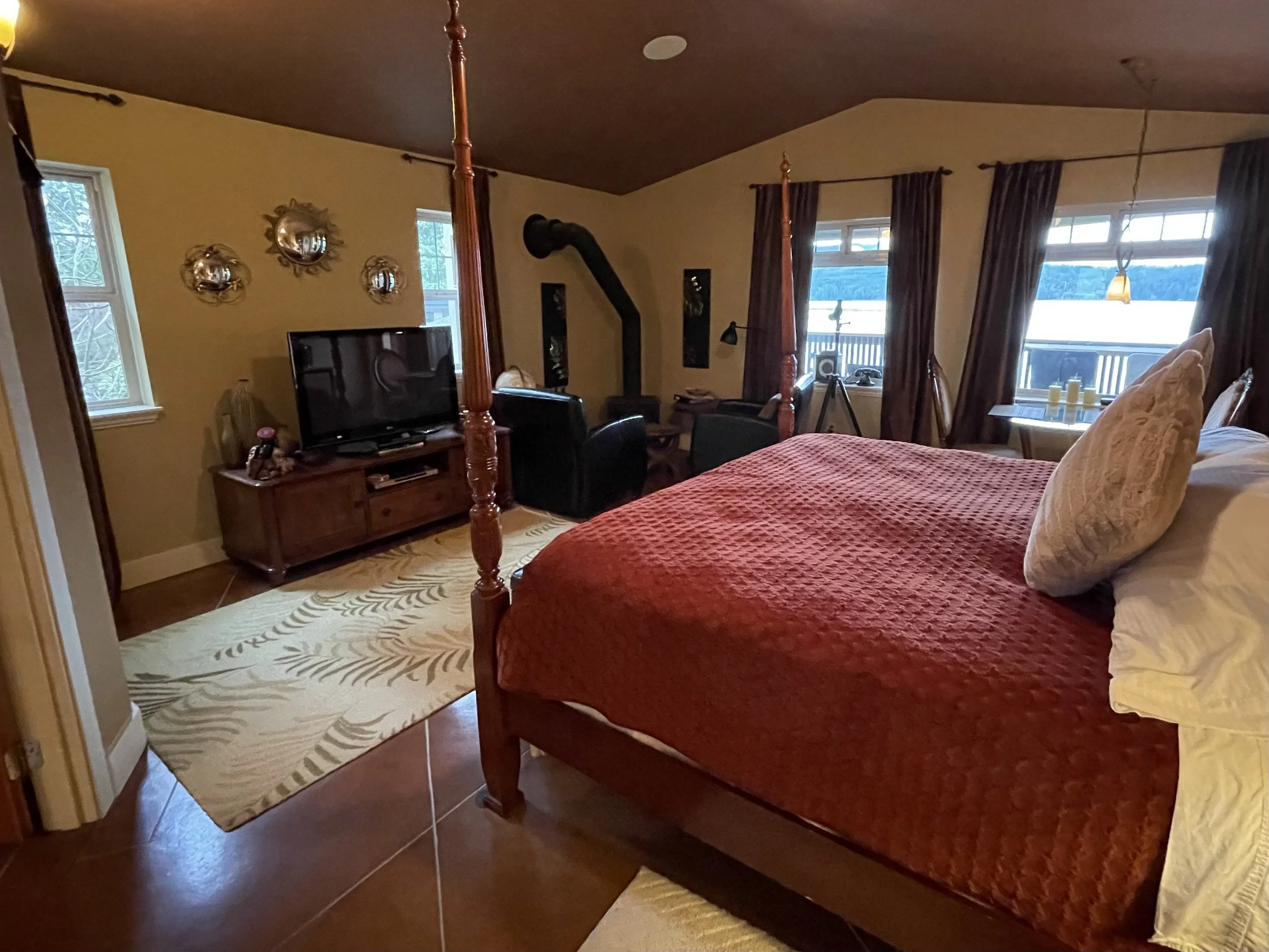AFRICAN QUEEN FEATURES A KING SIZE CLOUD BED, PRIVATE DECK WITH OCEAN VIEWS, WOOD BURNING FIREPLACE, SLIPPER TUB, TWO PERSON SHOWER, MOOD LIGHTING, NETFLIX, AMAZON MUSIC, IN FLOOR HEATING, KITCHENETTE WITH BAR FRIDGE AND MICROWAVE.