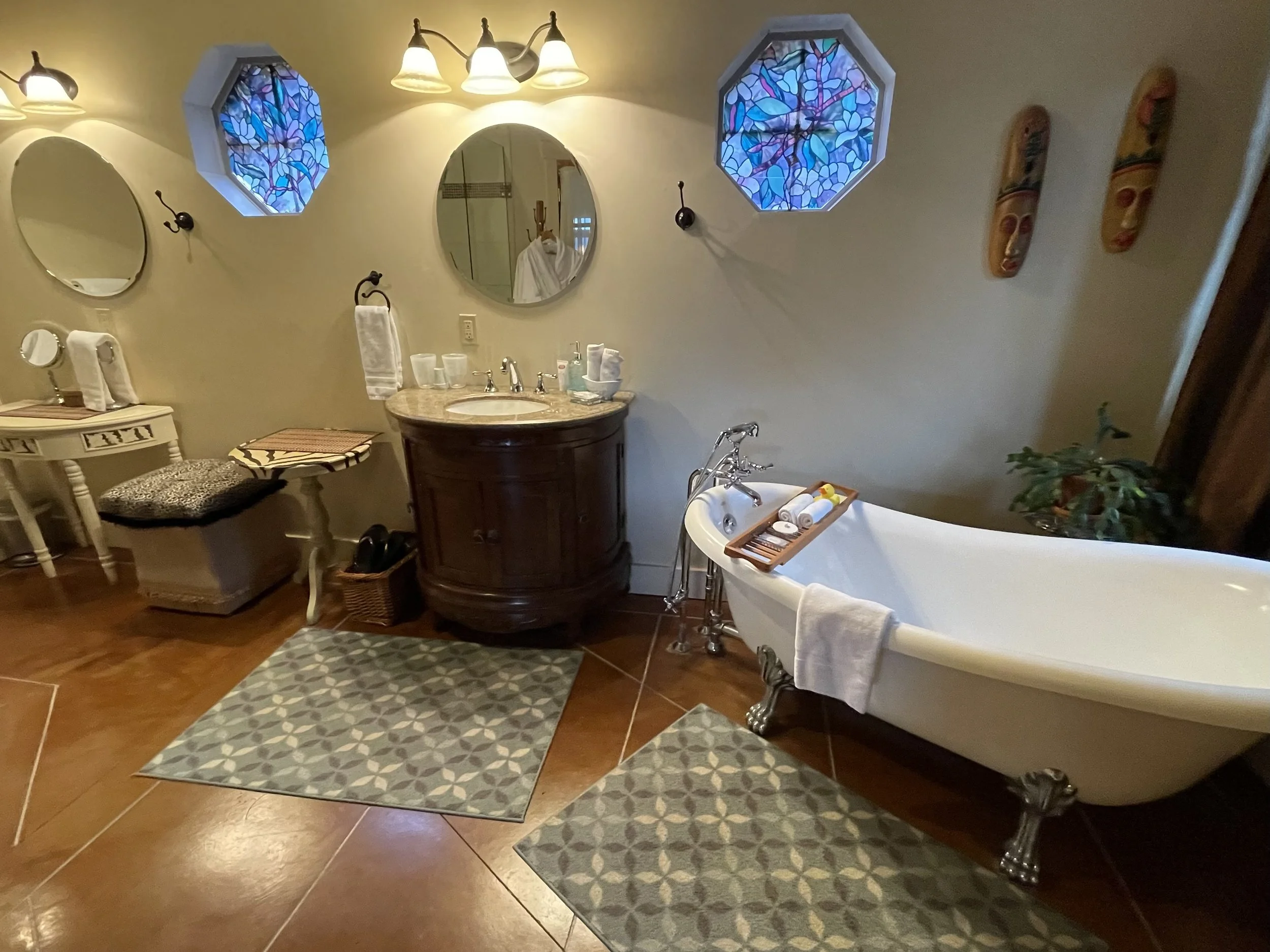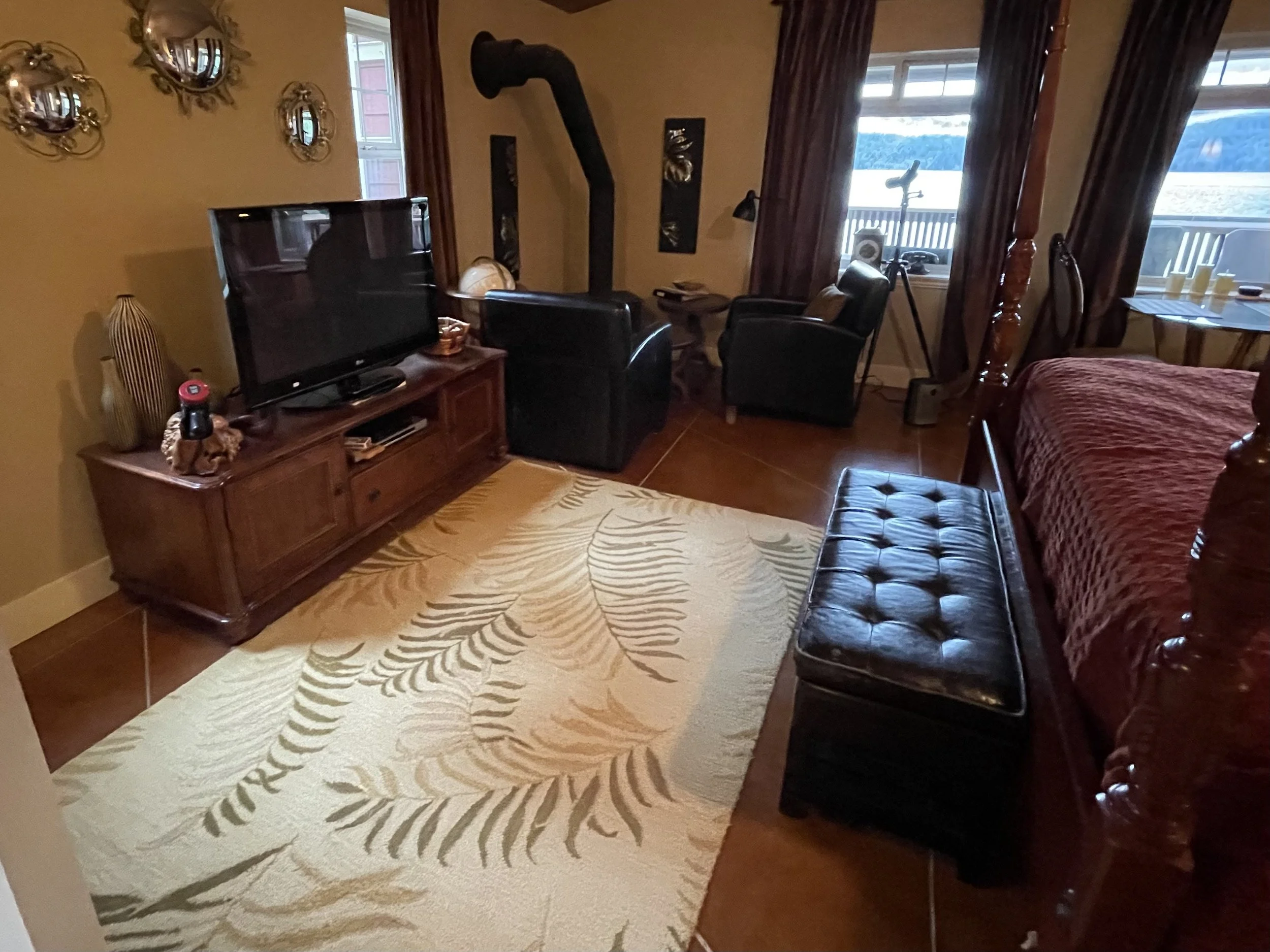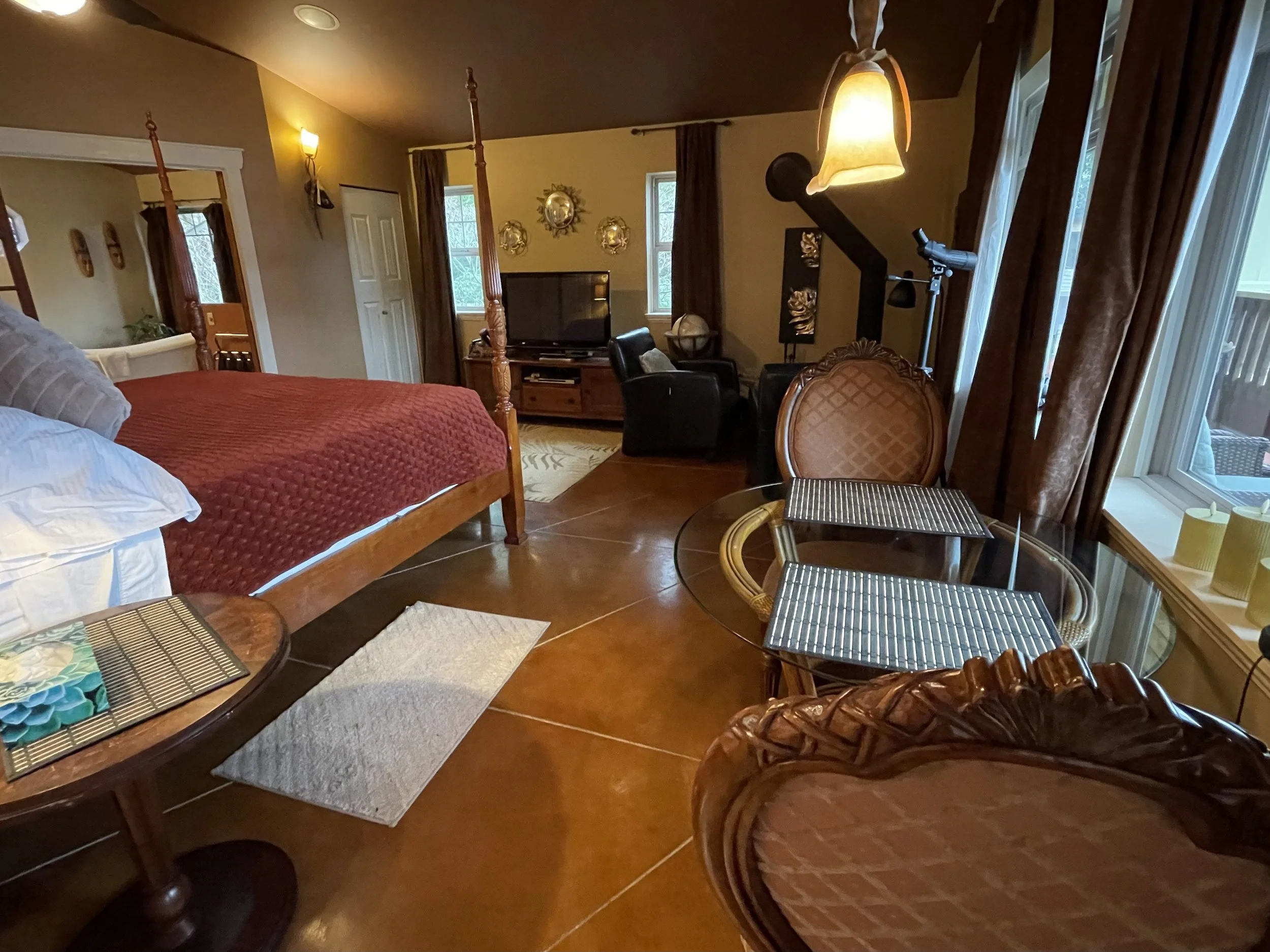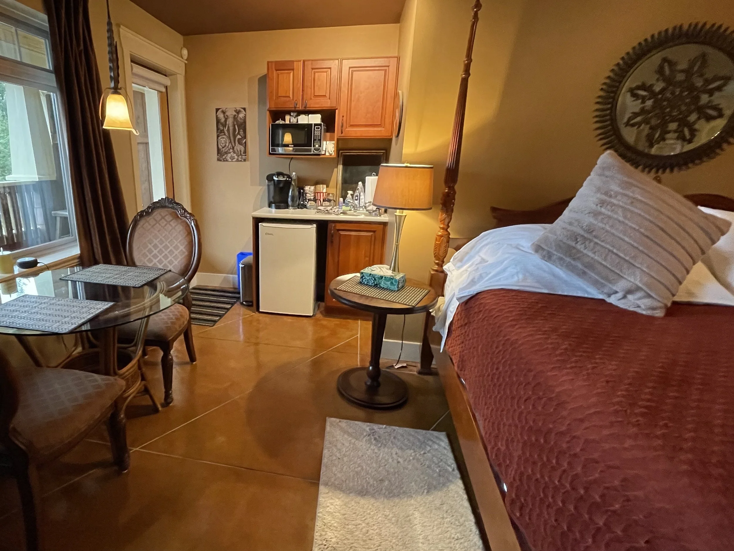 AFRICAN QUEEN FEATURES A KING SIZE CLOUD BED, PRIVATE DECK WITH OCEAN VIEWS, WOOD BURNING FIREPLACE, SLIPPER TUB, TWO PERSON SHOWER, MOOD LIGHTING, NETFLIX, AMAZON MUSIC, IN FLOOR HEATING, KITCHENETTE WITH BAR FRIDGE AND MICROWAVE.