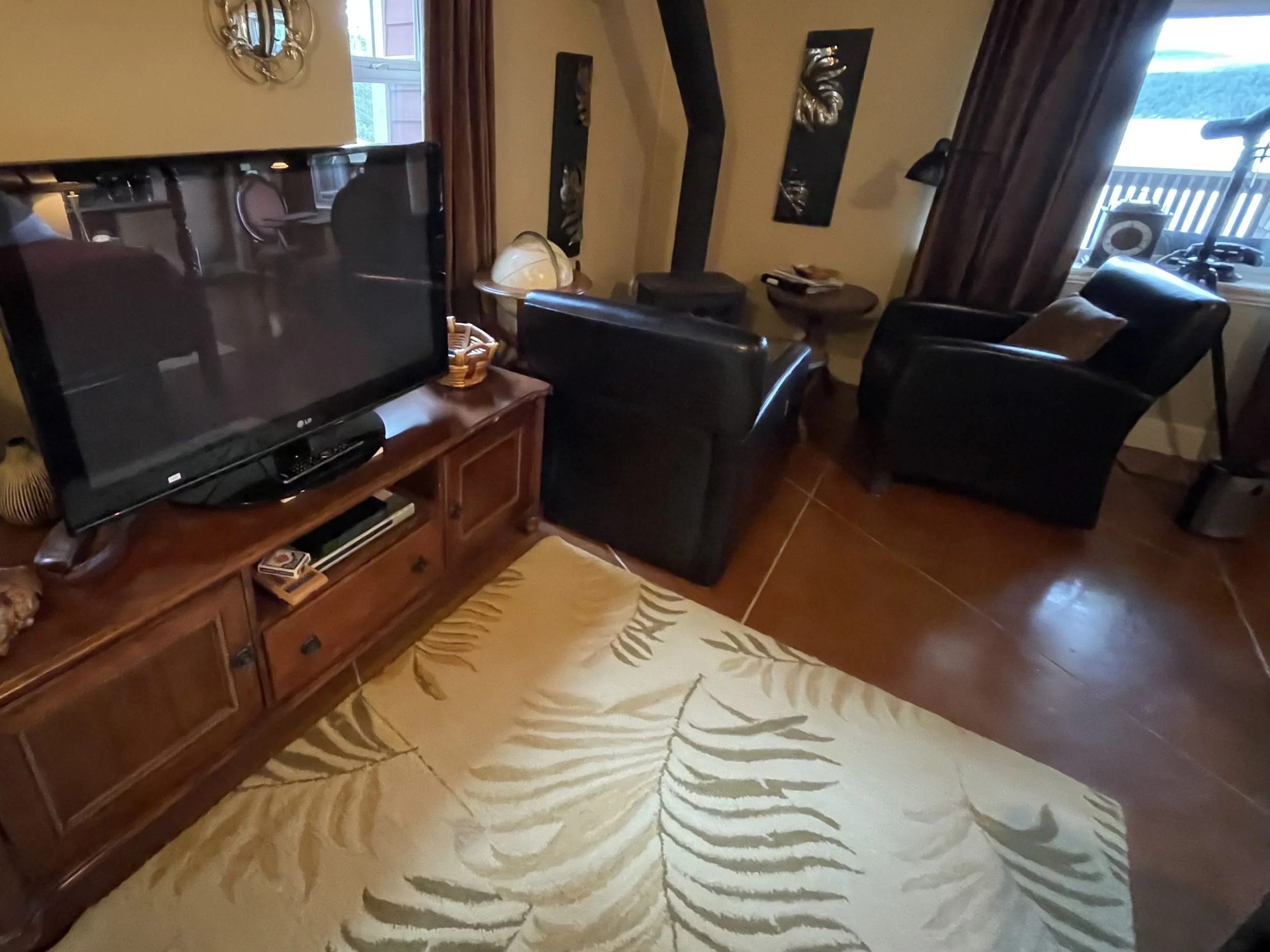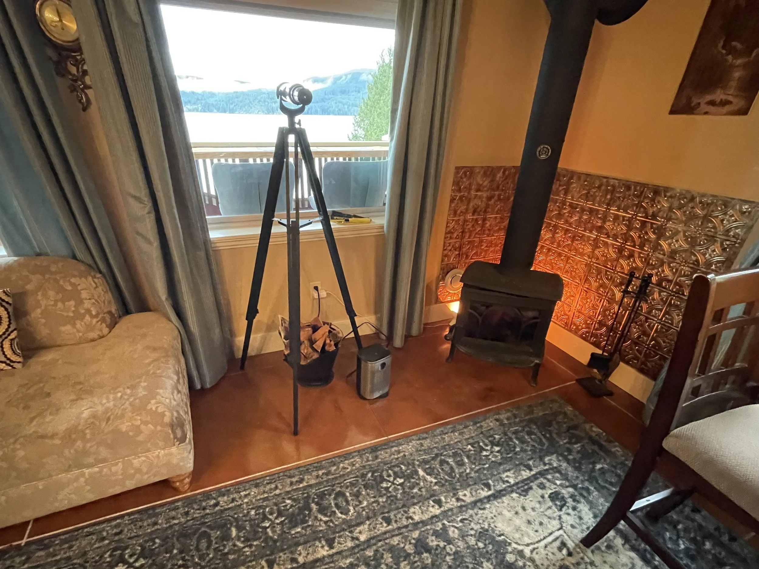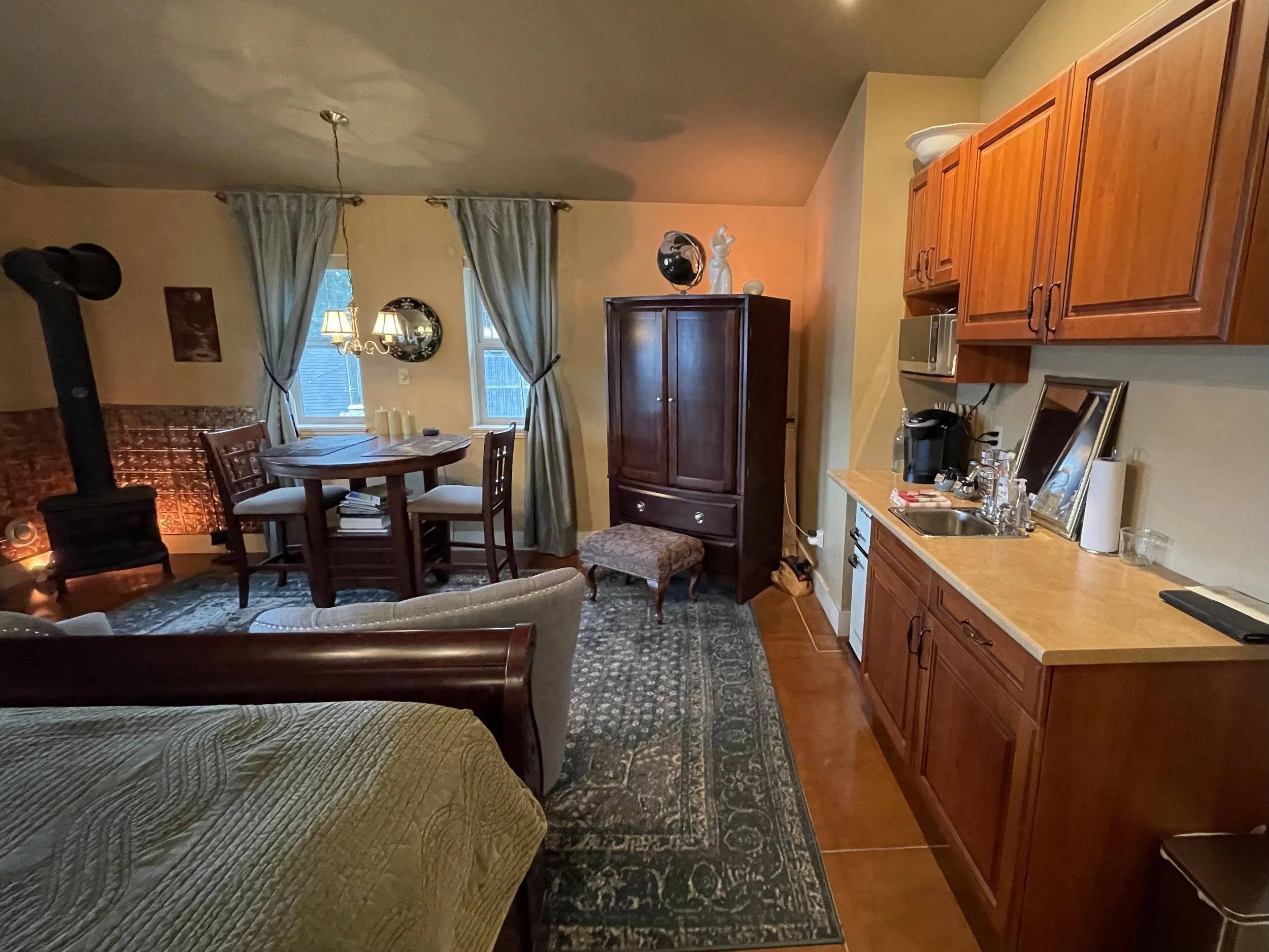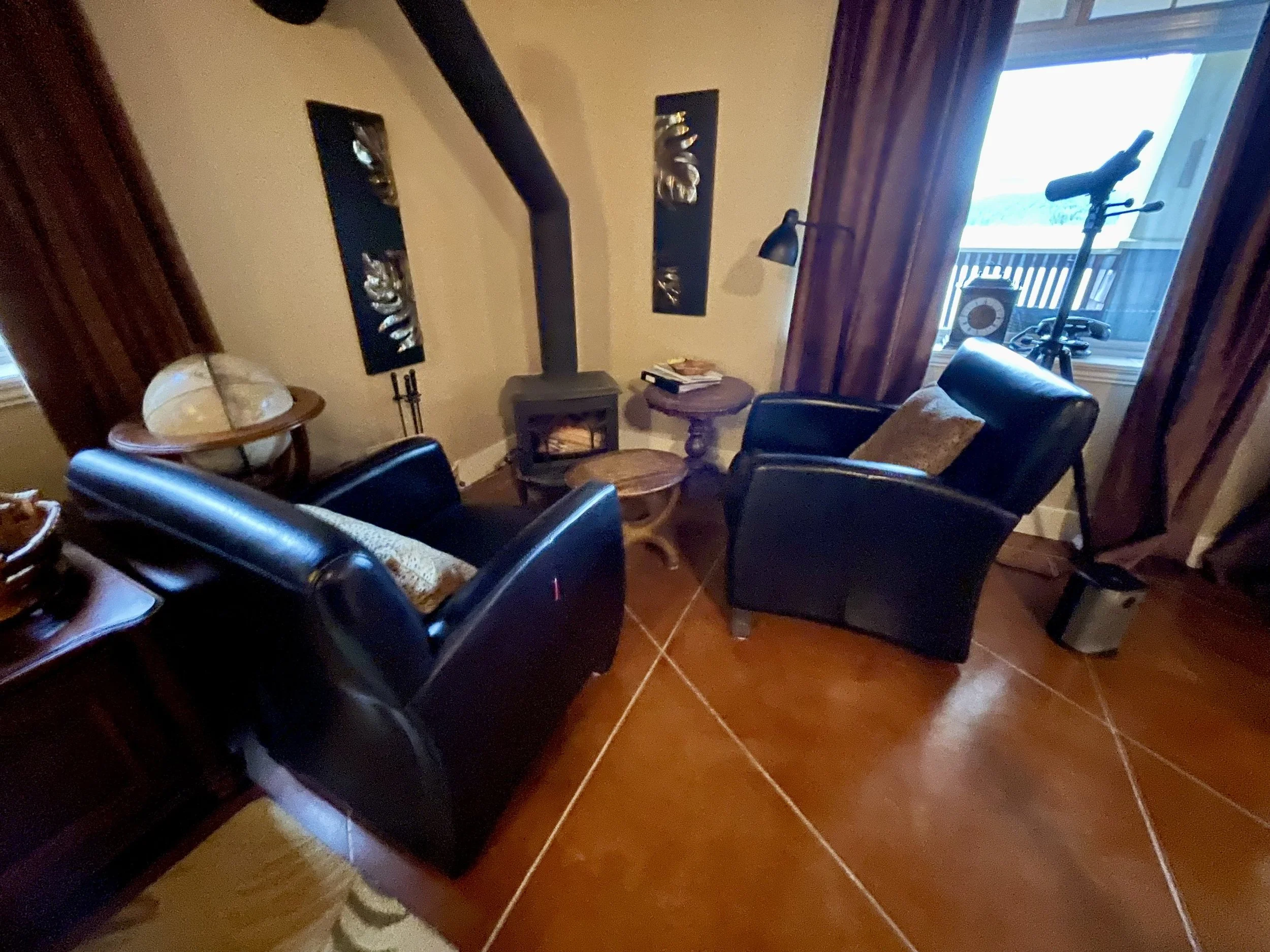 AFRICAN QUEEN FEATURES A KING SIZE CLOUD BED, PRIVATE DECK WITH OCEAN VIEWS, WOOD BURNING FIREPLACE, SLIPPER TUB, TWO PERSON SHOWER, MOOD LIGHTING, NETFLIX, AMAZON MUSIC, IN FLOOR HEATING, KITCHENETTE WITH BAR FRIDGE AND MICROWAVE.