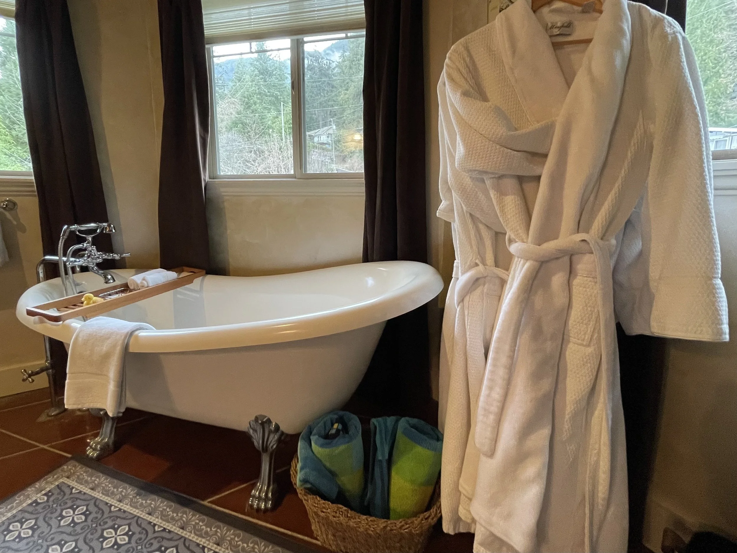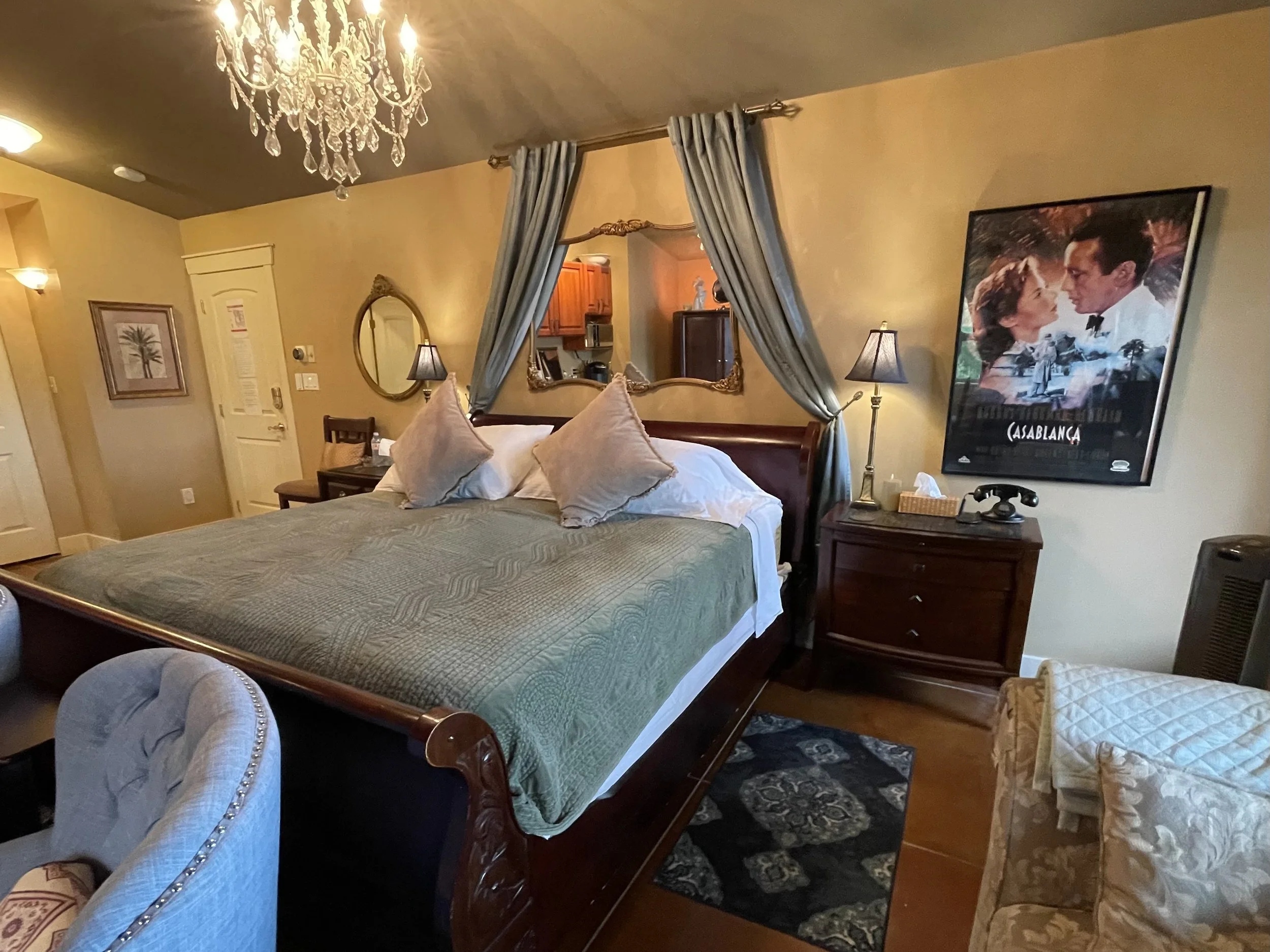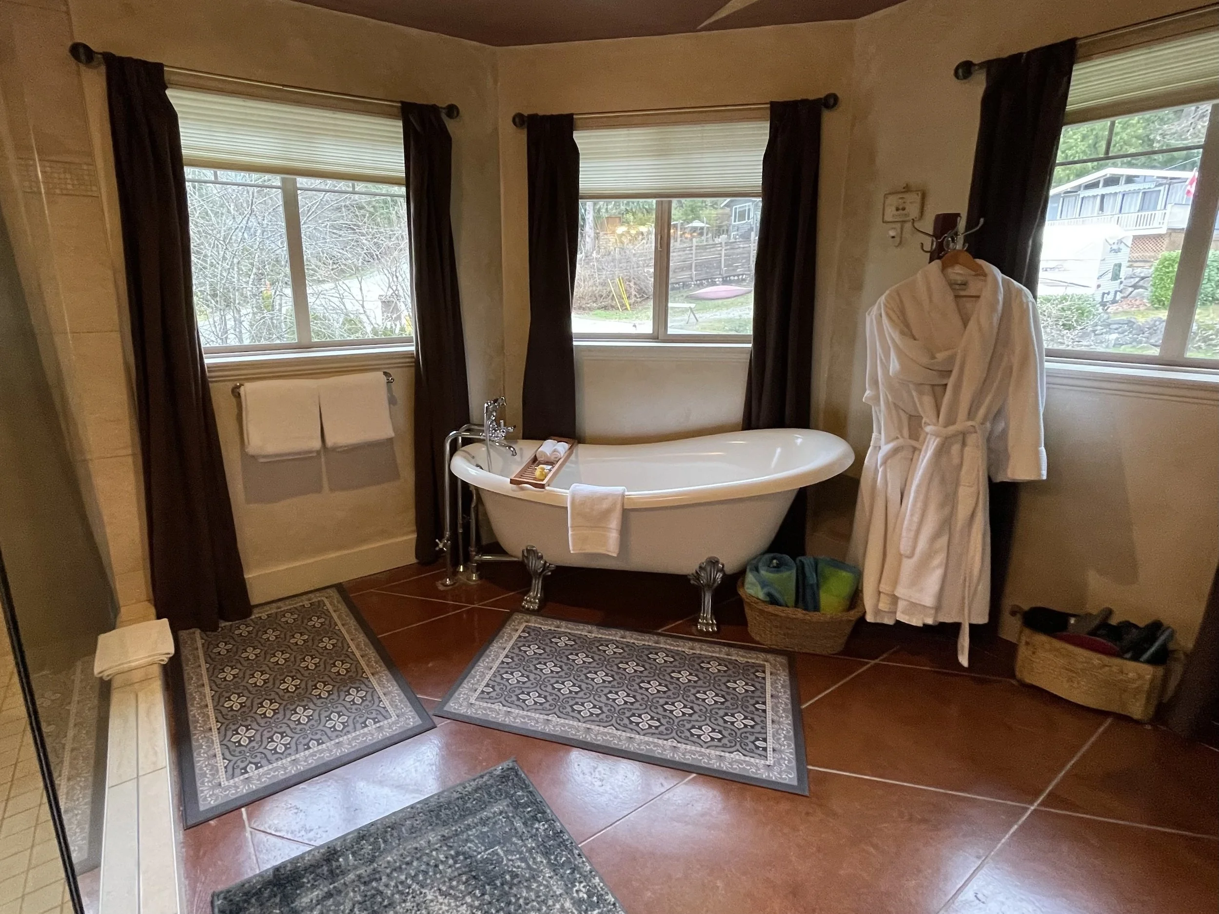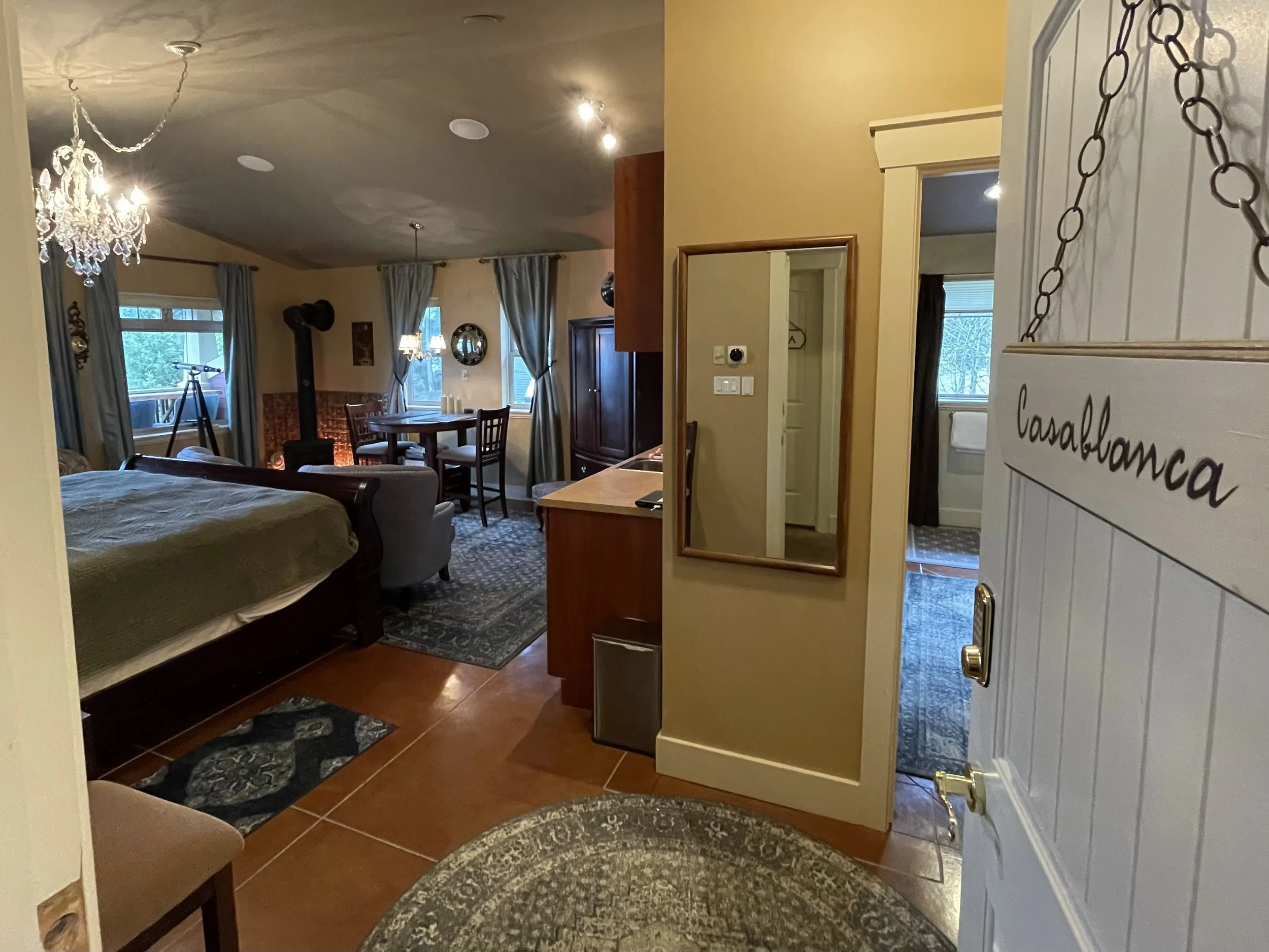 CASABLANCA FEATURES A KING SIZE CLOUD BED, PRIVATE DECK WITH OCEAN VIEWS, WOOD BURNING FIREPLACE, SLIPPER TUB, TWO PERSON SHOWER, MOOD LIGHTING, NETFLIX, AMAZON MUSIC, IN FLOOR HEATING, KITCHENETTE WITH BAR FRIDGE AND MICROWAVE.