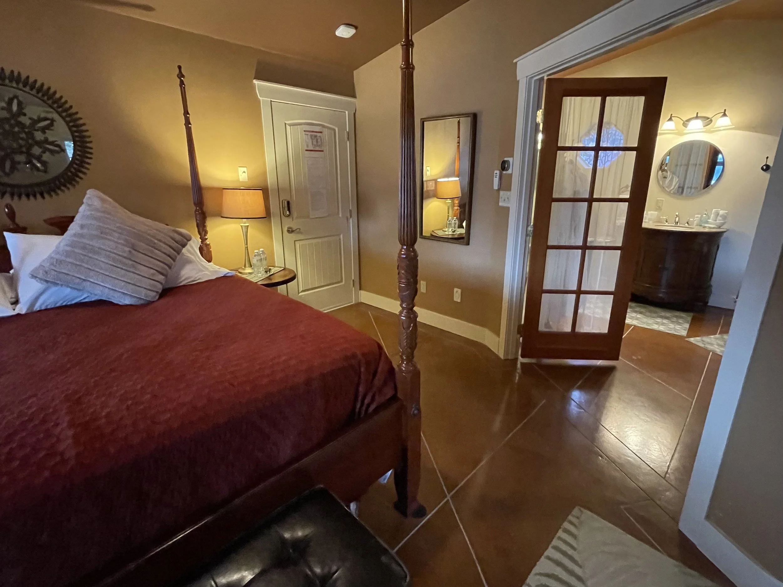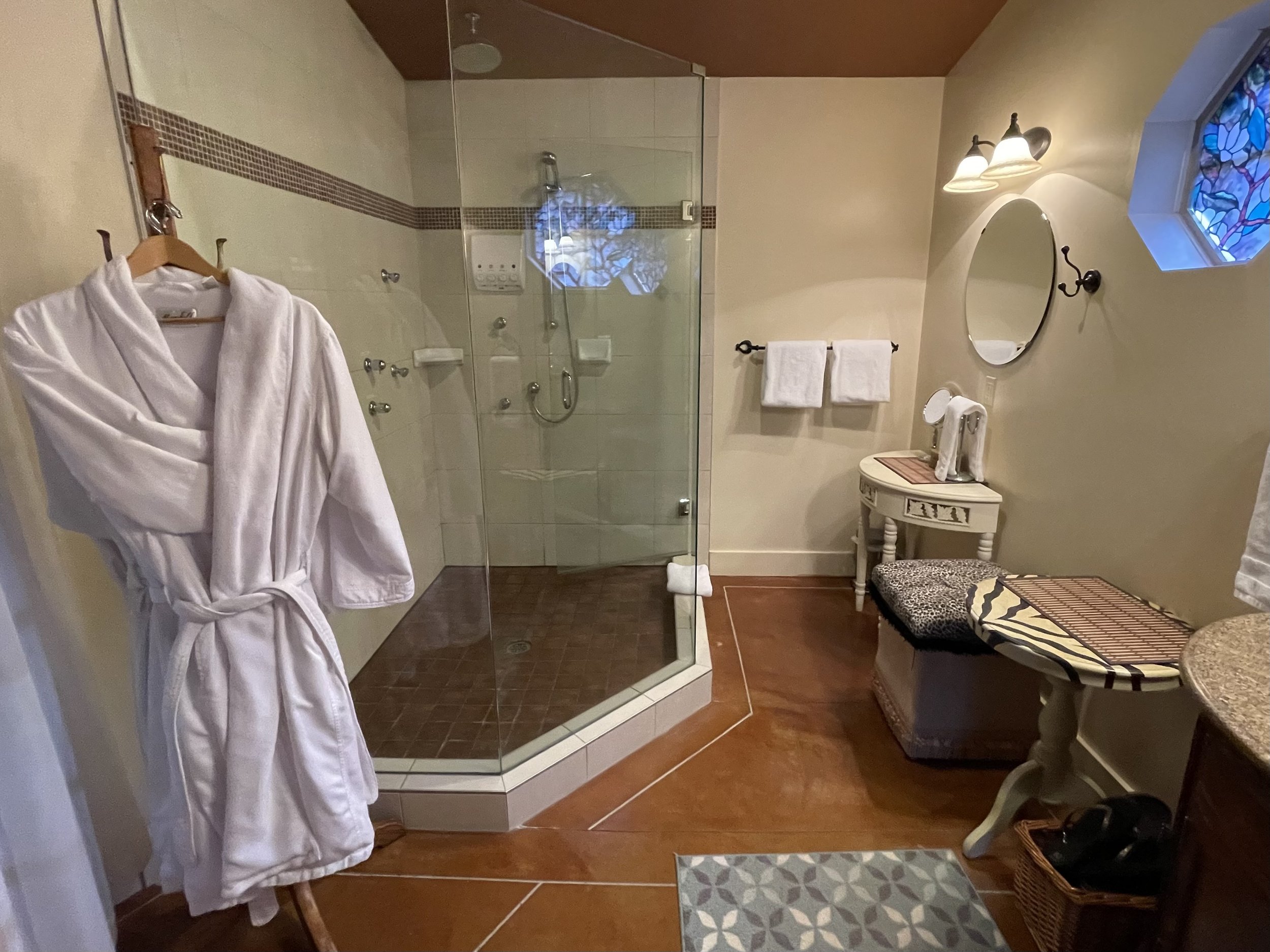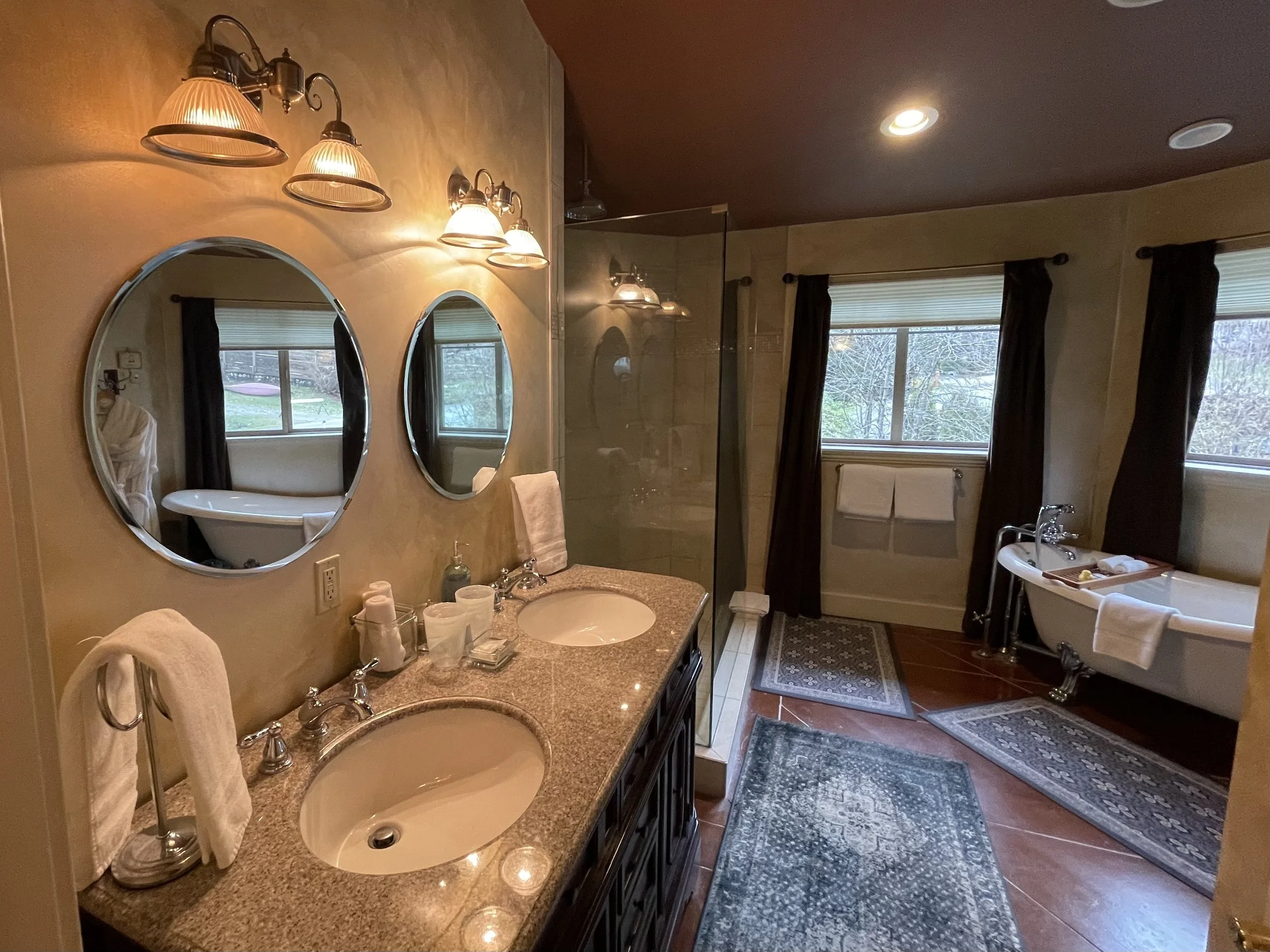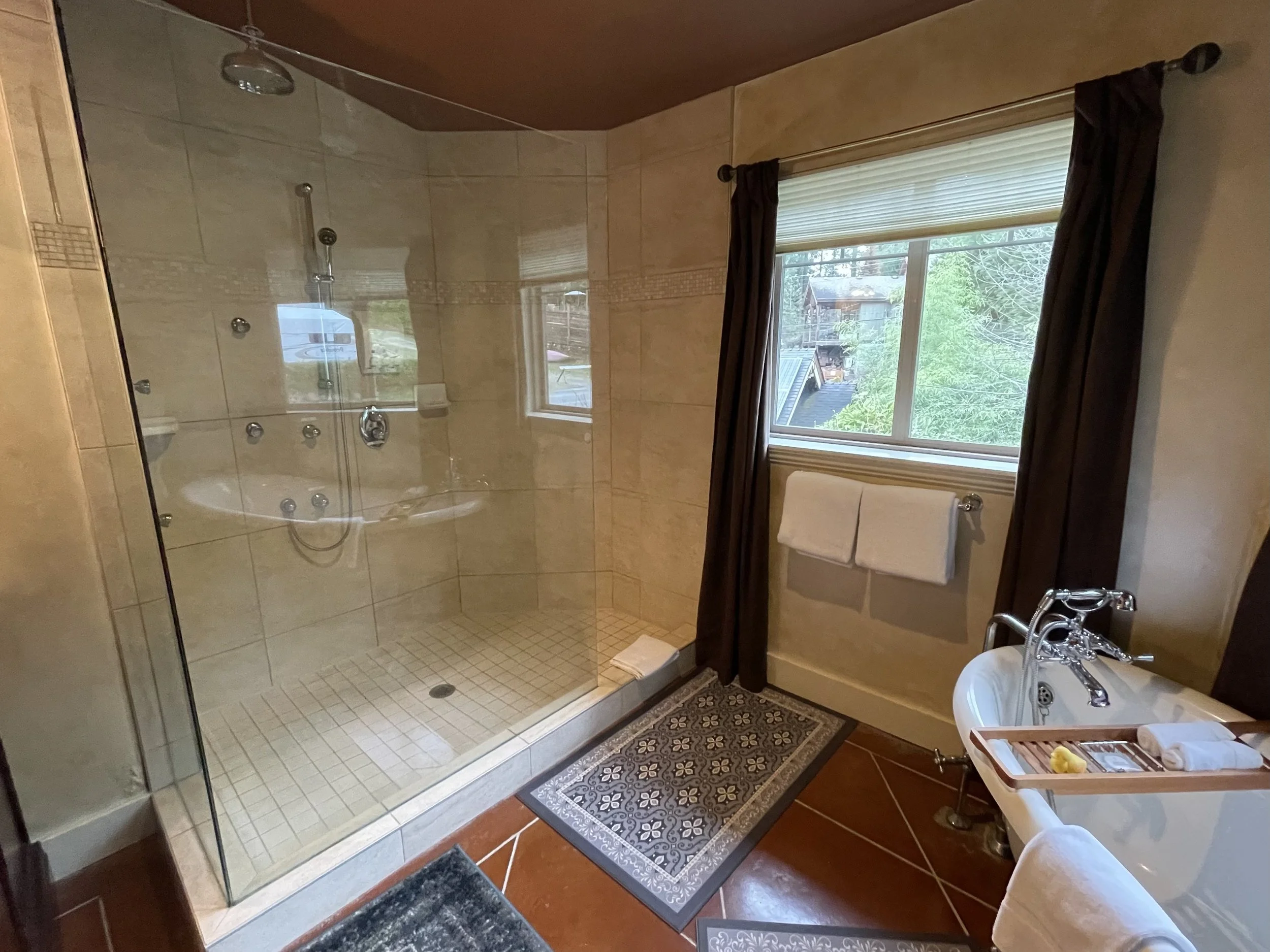CASABLANCA FEATURES A KING SIZE CLOUD BED, PRIVATE DECK WITH OCEAN VIEWS, WOOD BURNING FIREPLACE, SLIPPER TUB, TWO PERSON SHOWER, MOOD LIGHTING, NETFLIX, AMAZON MUSIC, IN FLOOR HEATING, KITCHENETTE WITH BAR FRIDGE AND MICROWAVE.