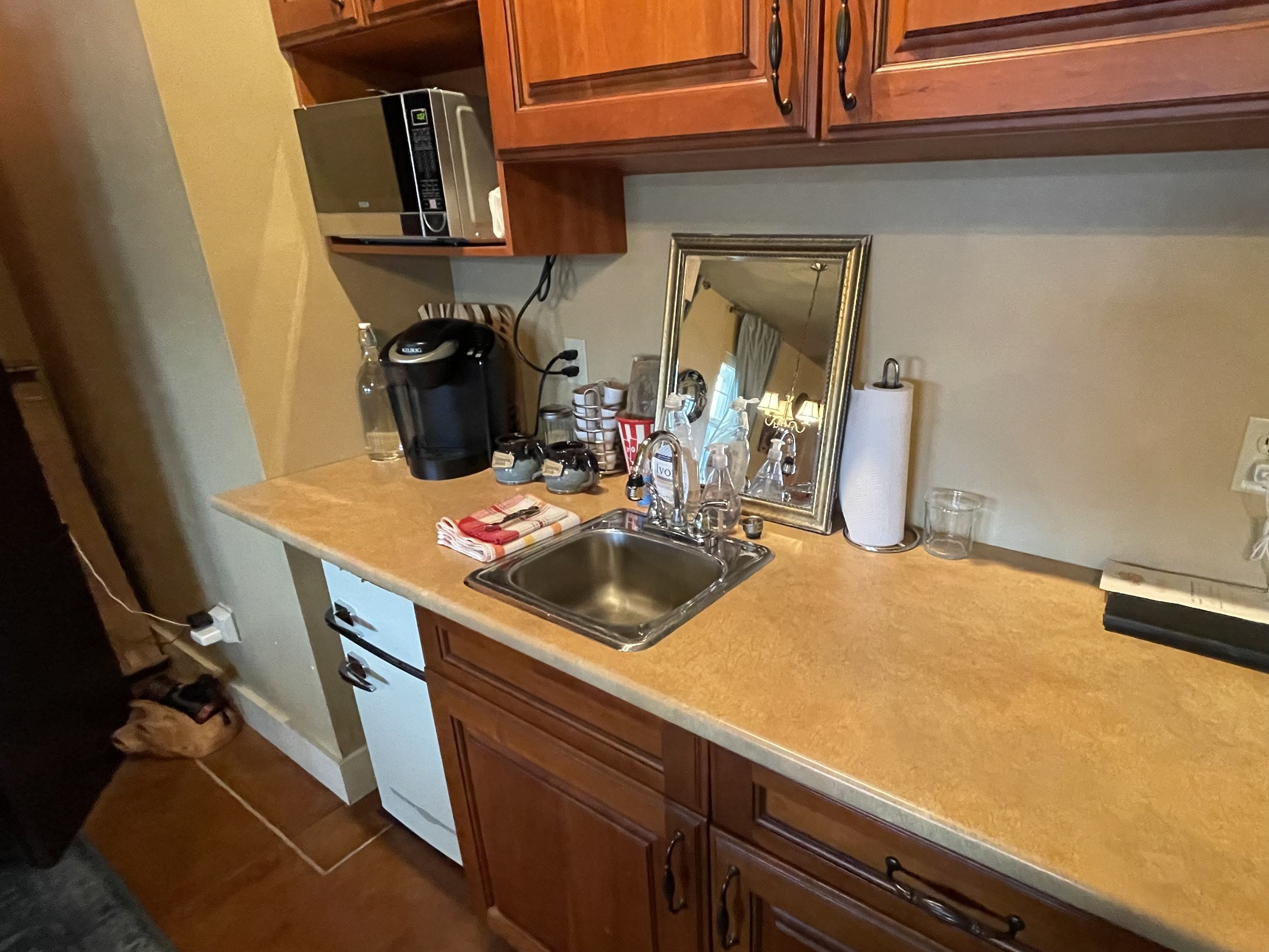 A: No, the rooms have a bar fridge, microwave, glassware, and dishes.